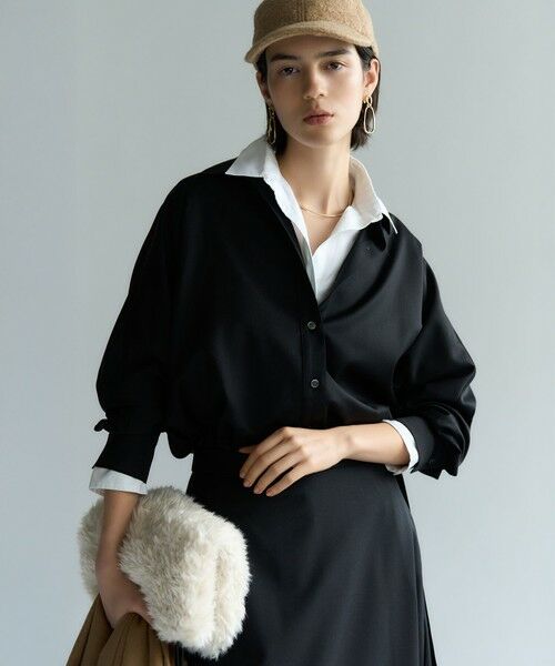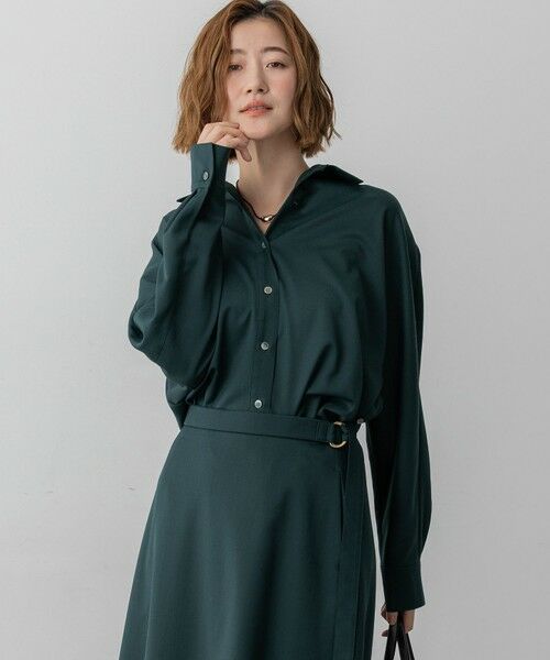 肩から袖にかけてゆったりとしたシルエットが特徴のドルマンスリーブシャツです。リラックス感がありながらも上品な印象を与え、気になる体型をさりげなくカバーしてくれます。脇に配されたボタンを留めることで、カシュクール風の着こなしもお楽しみいただける2WAY仕様です。一枚でさらりと着るのはもちろん、同素材のスカートと合わせてセットアップ風に着用すれば、より洗練された印象に。きれいめパンツと合わせてオフィススタイルに、デニムやスニーカーと合わせてカジュアルダウンするなど、幅広いシーンで活躍し、大人の女性の着こなしを上品に彩ります。カラーはシックで上品な印象を与えるブラック(#005)、深みのある落ち着いたグリーン(#064)の2色展開です。
