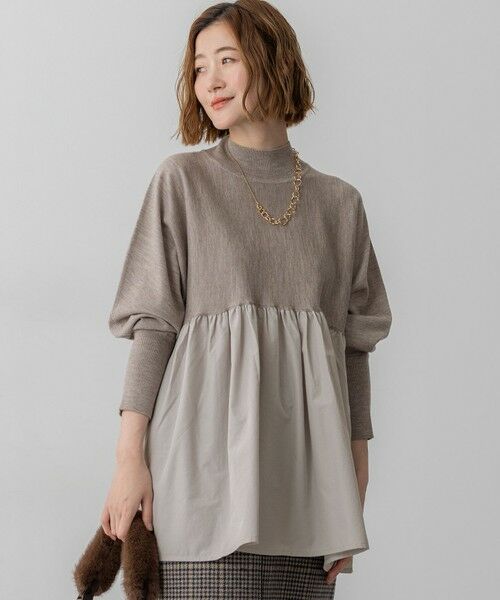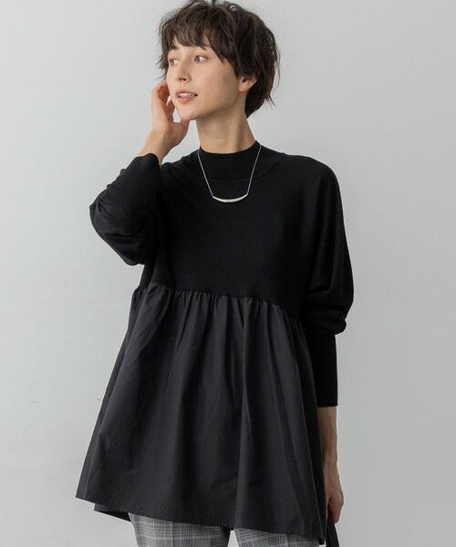 裾部分に軽やかな布帛素材をドッキングした、異素材コンビのニット。上身頃は、首元を優しく包み込むハイネックと、肩のラインを拾わないゆったりとしたドルマンスリーブが特徴。気になる二の腕やボディラインをさりげなくカバーしながら、リラックス感のある着心地とこなれた印象を両立させます。裾の布帛部分にはギャザーをたっぷりと施し、ふんわりと広がるシルエットが女性らしさを引き立てます。シンプルなボトムスに合わせるだけで、洗練された大人のカジュアルスタイルが完成。デニムと合わせてデイリーに、きれいめパンツやスカートと合わせれば、ちょっとしたお出かけにも活躍する万能アイテムです。 カラーは、上品で知的な印象のネイビー(#075)、シックで着回し力抜群のブラック(#005)、優しく柔らかな雰囲気を醸し出すベージュ(#033)の3色展開です。