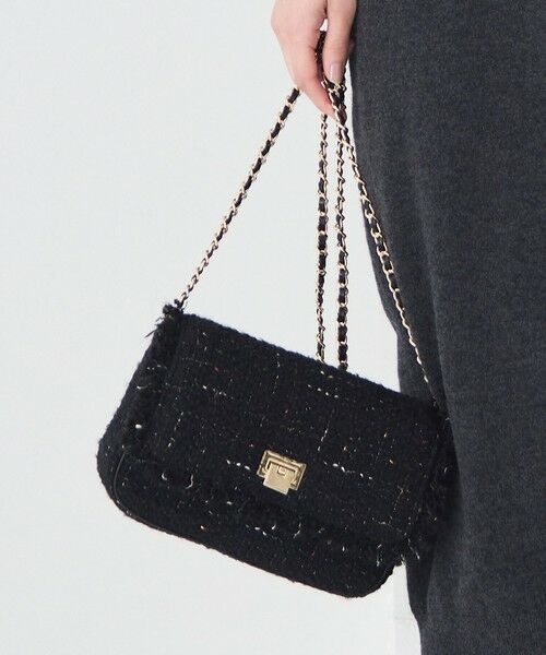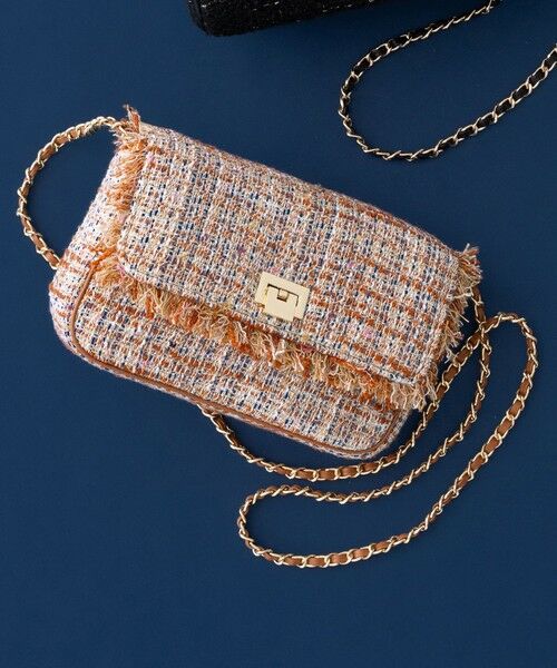 上品なGIOLICAのツイード素材を使用したショルダーバッグです。意匠性のある様々な糸が織り込まれており、上品なデザインに仕上がっています。フラップ部分の縁にはフリンジ加工が施されており、柔らかな表情と程よい華やかさを演出。中央のゴールドの金具が高級感を添えています。チェーンストラップはフェイクレザーを編み込んだゴールドチェーンデザインで、肩掛けや斜め掛けでもお使いいただけるデザインです。パーティーシーンはもちろん、カジュアルスタイルのアクセントとしても活躍してくれます。カラーは柔らかなテラコッタミックス(#334)、品の良いブルーミックス(#370)、シックな印象でシーンを問わず使えるブラックミックス(#305)の3色展開です。