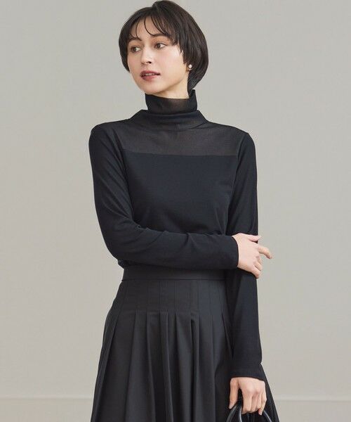 首もとにシアーなチュールを施したハイネックカットソー。厚手のニットやリバーコートなどのアウターから、繊細なチュールが覗くことで、いつもの着こなしに洗練されたコントラストと奥行きを与えます。身頃には滑らかな肌触りのリヨセル混素材を使用しており、ニットやカーディガンを重ねてももたつかず、快適な着心地を叶えます。寒い時季にはアウターやニットのインナーとして、暖かくなってからは一枚でも着映えるので、長いシーズン活躍します。カラーは、着こなしを引き締めるシックなブラック(#005)と、やわらかく上品な印象を与えるベージュ(#033)の2色展開です。