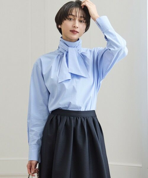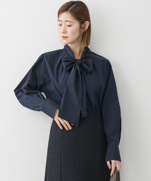 存在感のある太めのボウタイが顔周りを華やかに彩るブラウスです。一枚で主役になるのはもちろん、すっきりとシンプルなシルエットが大人の女性らしい品格を漂わせます。前後2WAYで着られる汎用性の高さも魅力。ツイードジャケットやジレのインナーとしても活躍し、着こなしに奥行きを与えてくれます。オフィススタイルから、休日のきれいめカジュアルまで、幅広いシーンで上品な着こなしを叶える一枚です。 カラーは、優しく上品な印象のアイボリー(#002)、知的でシックな着こなしが叶うネイビー(#075)、顔周りを明るく見せる爽やかなスカイブルー(#072)の3色展開です。