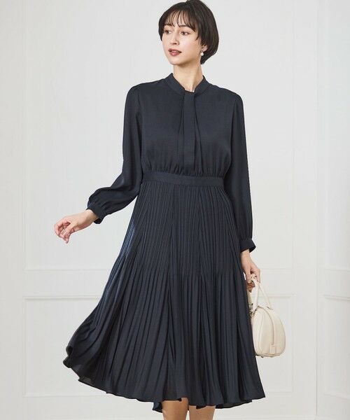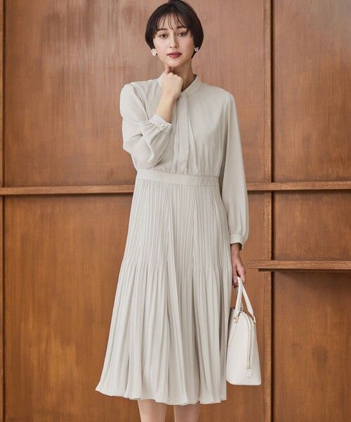 一枚でも品よく着映えする長袖フレアワンピース。上品な光沢感とさらっとした風合いで、ハレの日にぴったりなアイテムです。胸元フロントディテールや、スカート切り替え部分の繊細なランダムプリーツなど、さりげなく随所にデザインをきかせることで、柔らかく優美な女性らしさを演出します。袖口についたパール釦がワンポイントに。ツイードジャケットと合わせても素敵に着こなせるよう、華美になりすぎない上品なデザインに仕上げました。ハレの日にはもちろん、お仕事やお出かけ着としても汎用性の高いアイテムです。カラーは柔らかく華やかな印象のベージュ(#033)、きちんと感が増す落ち着きのあるネイビー(#075)の2色展開です。