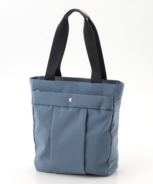 本体素材にコットンとナイロンの混紡素材64クロスを使用。正面のプリーツやあえて無地テープを使用したハンドルなどで、スッキリと少しキレイ目な印象のトートバッグ。正面に出し入れがしやすい上向きファスナーポケットや背面にもマグネットホック付きポケットがあり、どちらもB5サイズ(18.2cm×25.7cm)のノートが収納可能。本体収納はA4サイズ(21cm×29.7cm)が縦にも横にも収納可能です。お仕事やお稽古事などにもお使いいただける軽量なトートバッグです。