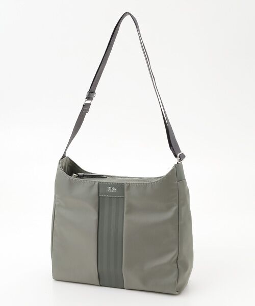 光沢のあるナイロンと、ストライプの型押し牛革の組み合わせのA4サイズも収納できるトートバッグです。ストライプの型押しは、近くで見るとヘリンボーンの型押しになっており、光の加減でさりげなくストライプに見えるようになっています。カジュアルな雰囲気もありつつ、革もあしらっていることからきちんと感も感じられるバッグとなっています。