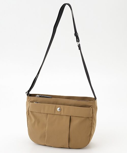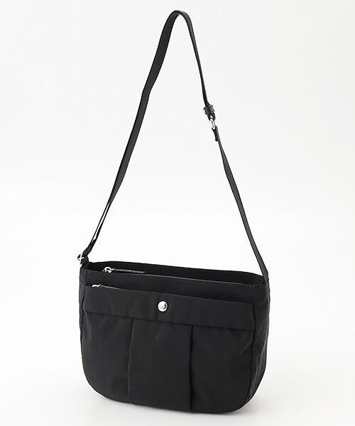 本体素材にコットンとナイロンの混紡素材64クロスを使用。正面のプリーツやあえて無地テープを使用したショルダーストラップなどで、スッキリと少しキレイ目な印象のショルダーバッグです。正面に出し入れがしやすい上向きファスナーポケットや背面にもマグネットホック付きポケットがあり、本体収納は長財布も収納できるサイズになっております。