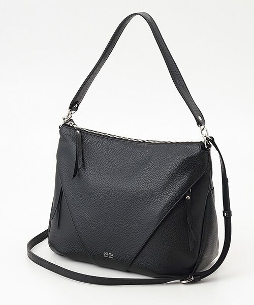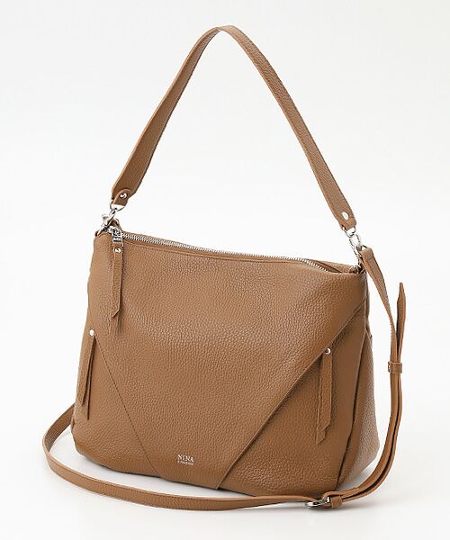 胴判に逆三角形の切り替えをして、切り替えに合わせてファスナーポケットが付いています。革はイタリアのシュリンク型押し革で程よく柔らかさのある革を使用し、ファスナーの引手は長い革紐を付けてアクセントにしています。内容量もしっかりあるので、日常使いやお出かけのシーンにも使いやすいサイズ感です。シーンによってワンショルダーと、ショルダーで使用できる2WAYのバッグです。
