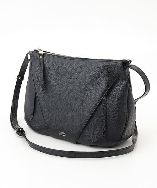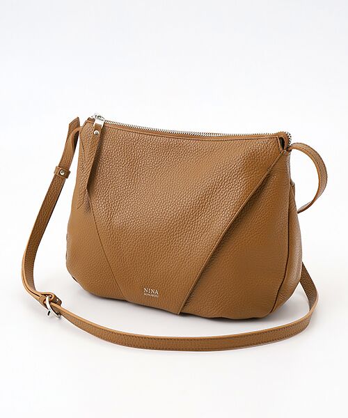 胴判に逆三角形の切り替えをして、切り替えに合わせてファスナーポケットが付いています。革はイタリアのシュリンク型押し革で程よく柔らかさのある革を使用し、ファスナーの引手は長い革紐を付けてアクセントにしています。しっかりタックが入っているので、見た目のサイズ感の印象よりも物が入るショルダーバッグです。