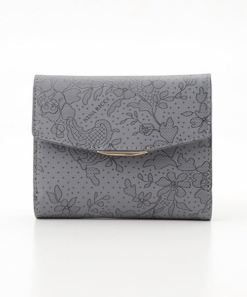 ソフトなスムース牛革にUVプリントを施したお財布シリーズ。プリントの柄はNINA RICCIの花柄レースをアレンジしたものです。「花モチーフ」や「レース」はNINA RICCIのブランドコードに含まれる重要なシンボルでありファブリックです。また、かぶせの先端にはキラリと光るゴールドのブローチが上品さを演出。お財布は軽やかさを意識した薄いつくりになっています。