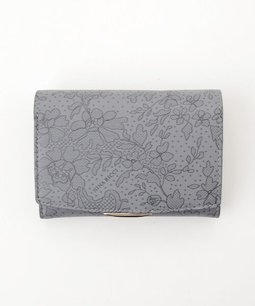 ソフトなスムース牛革にUVプリントを施したお財布シリーズ。プリントの柄はNINA RICCIの花柄レースをアレンジしたものです。「花モチーフ」や「レース」はNINA RICCIのブランドコードに含まれる重要なシンボルでありファブリックです。また、かぶせの先端にはキラリと光るゴールドのブローチが上品さを演出。お財布は軽やかさを意識した薄いつくりになっています。