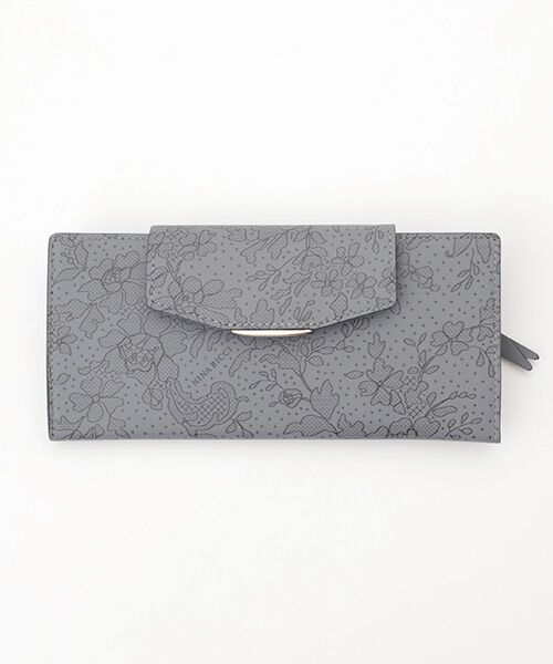 ソフトなスムース牛革にUVプリントを施したお財布シリーズ。プリントの柄はNINA RICCIの花柄レースをアレンジしたものです。「花モチーフ」や「レース」はNINA RICCIのブランドコードに含まれる重要なシンボルでありファブリックです。また、かぶせの先端にはキラリと光るゴールドのブローチが上品さを演出。お財布は軽やかさを意識した薄いつくりになっています。