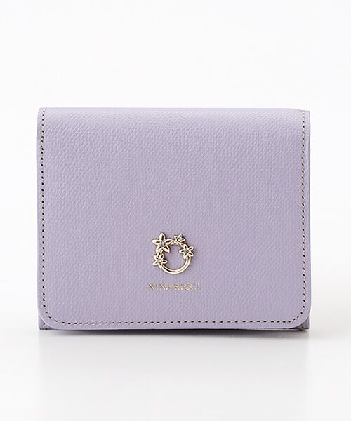 NINA RICCI コレクションで使用されている花柄をモチーフにしたリング状のブローチがエレガントでありながら大人可愛い印象のお財布シリーズ。表素材には傷が目立ちにくい型押しの牛革を、内装には同色系のスムースな牛革を使用しています。大きく開くボックス型小銭入れや仕切り付きの札入れスペースなど機能的でありながら、横幅や厚さを極力スリムに仕立てたお財布です。