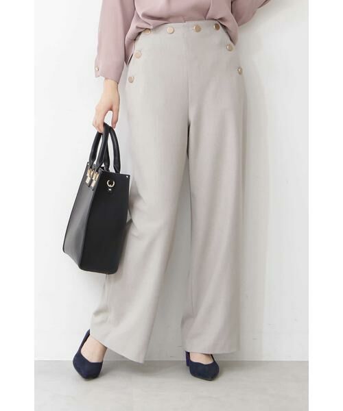 大人らしい雰囲気で着られるストレートワイドパンツ。マリンパンツディテールの正面ゴールド調ボタンがポイントです。ウールタッチな合繊素材でシワにもなりにくくケアが楽チンな生地感です。デザインが効いているのでニットなどのトップスをインするだけで、ウィンターマリンコーデが完成します。※裏地有り