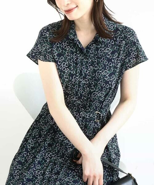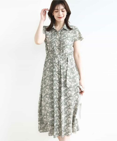 チェーンのようなプリントを落ち着いた色合いで大人っぽく仕上げたワンピース。ネックをきれいに見せる衿と着用したときに開くようにパターンで調整したスキッパーデザインがポイントです。