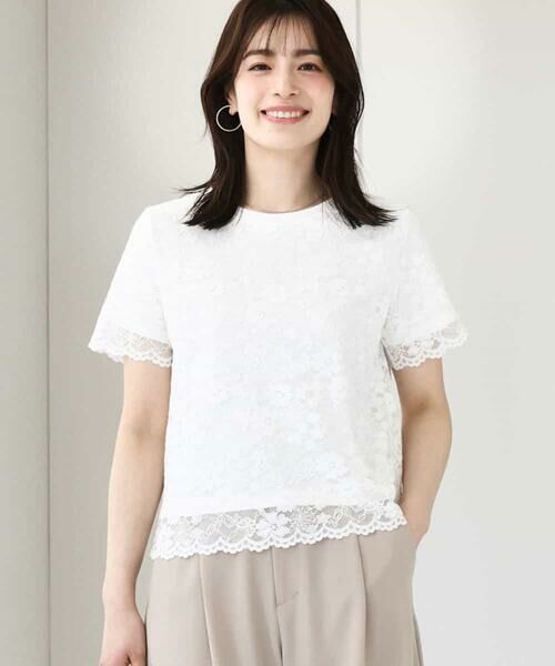 フェミニンな印象のレースTシャツ。裾と袖口にはスカラップ耳端を贅沢に使用しました。