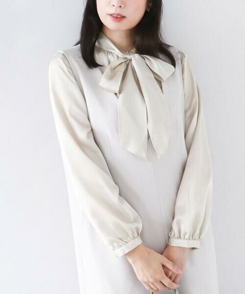 大きめのリボンは一枚でも華やか見え。きちんと感のあるブラウスに上品さをプラスしてくれます。一枚でもジャケットのインナーにも映えるデザインは、ジャンスカなどのインナーとしてもおすすめです。