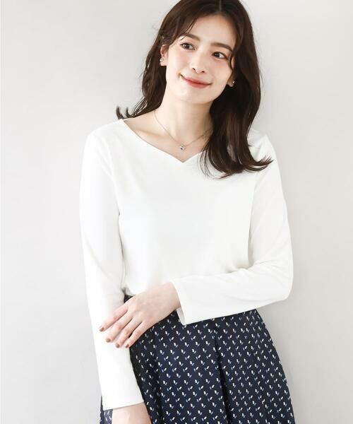 デコルテをきれいに見せてくれるハートネックがポイントのシンプルなインナーカットソー。前身頃のみ二重仕立てになっているため、ボディラインを拾いにくく、透けにくいのはもちろん、衿元と裾にステッチのないすっきりとした仕上がりが魅力です。