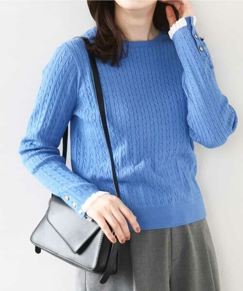 上品でクラシックな雰囲気のミニケーブル柄ニット。トラッドになりすぎない、袖口のメタル釦とシアーフリルディティールがポイントです。コンパクトなサイジングながら、編地の立体感でボディラインを拾いにくいのも高ポイント。