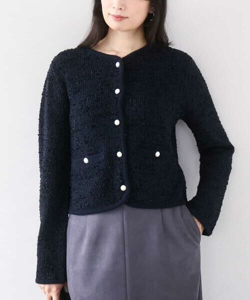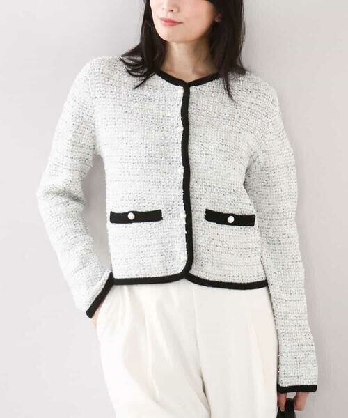 さっと気軽に羽織りやすい上品きれい見えなツイードニットジャケット。羽織りとしても良し、釦を留めてプルオーバーとして着こなしても良しなちょうどよく着映えるデザインも嬉しい。