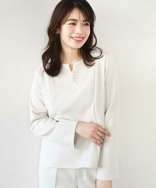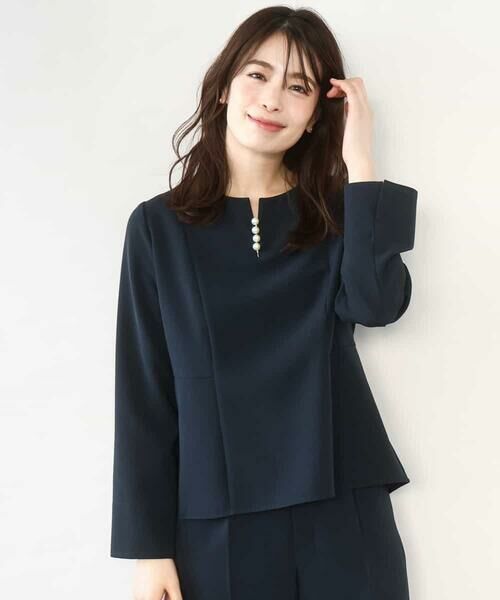 ボディラインをさりげなくカバーしつつ華やかさを演出するペプラムデザインのブラウス。後ろ身頃丈を少し長めにすることで、気になるヒップもカバーしてくれます。アクセントに胸元には取り外し可能なフェイクパールをあしらいました。外すとシンプルなブラウスとして着用可能。袖口は折り返し可能なスリット開きに。