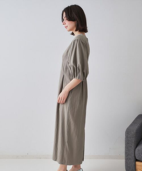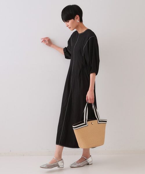 ボリュームタックスリーブと配色ステッチを効かせたナローワンピース