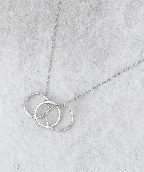 ビジューリングと2種類のメタルリングの3つが重なったロングタイプのネックレス。