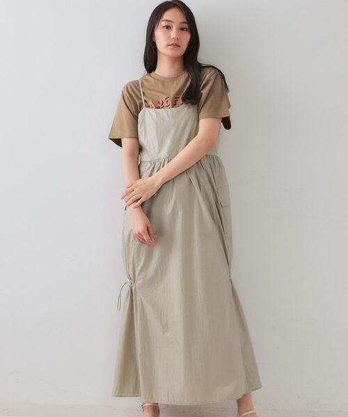 ドロストデザインと微光沢感のあるトレンド素材がおすすめのデザインキャミワンピース