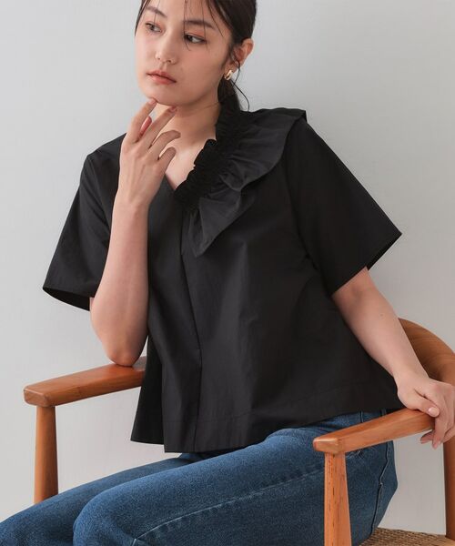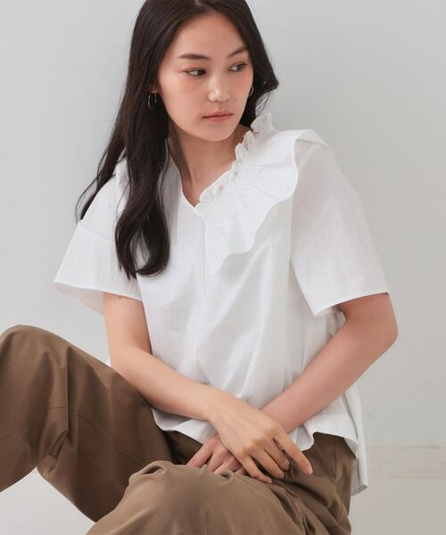 アシンメトリーに付けたフリルが華やかなVネックブラウス