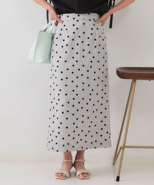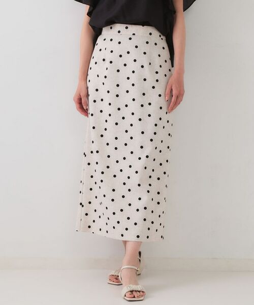 ・麻混素材に大胆なドット柄プリントが目を惹くナローロングスカートです。