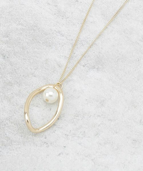 優雅なオーバル型のメタルパーツとフェイクパールが融合したスライドネックレスは、洗練された印象を与えるアイテム。