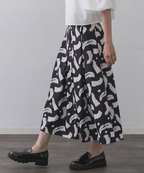 手書き風のブラッシュ柄が目を引く、タックフレアスカート