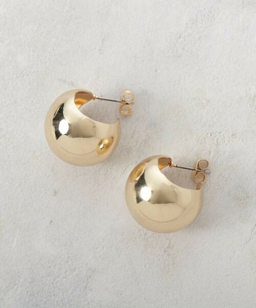 存在感のある大きめの丸いメタルピアスが、シンプルなスタイルに華やかさをプラス。