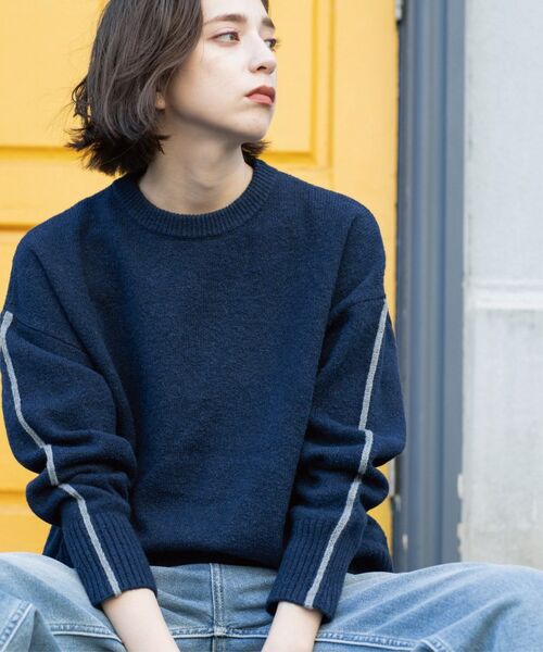 ・袖に配色のラインデザインを取り入れたクルーネックニット。