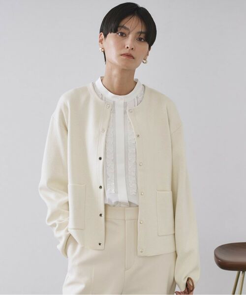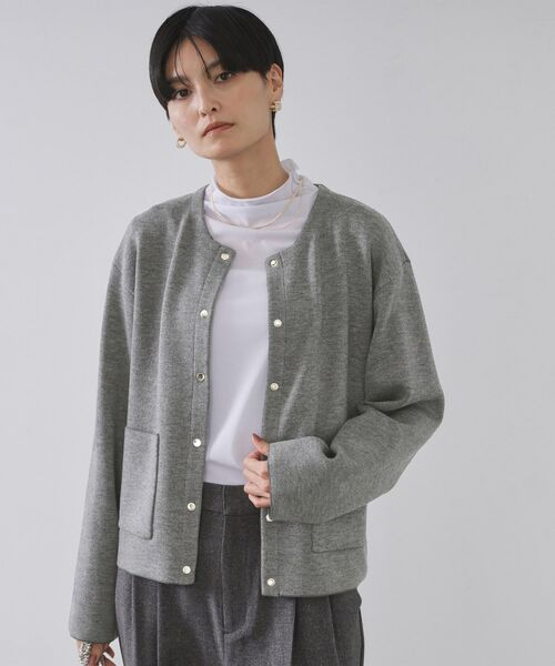 ・シャンパンゴールドのスナップボタンを効かせた、シンプルなニットカーディガン。