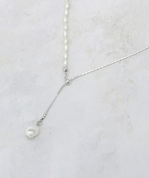 上品なフェイクパールを用いたシンプルなネックレスにスライド式の留め具を配し、長さを自由に調整できる洗練された佇まい。
