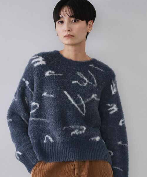 ・毛足のあるフェザーヤーンを使用したアート柄のジャカード編みニット。
