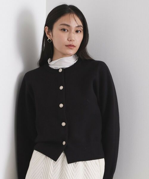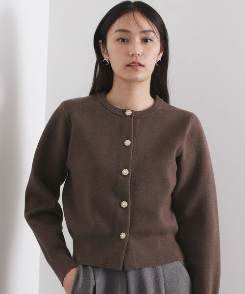フェイクパールビジューボタンをポイントにした華やかなニットカーディガン