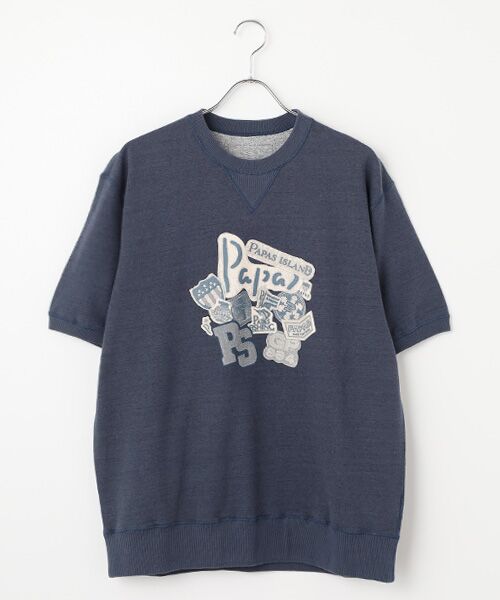 前身頃にPAPASワッペンコラージュプリントをあしらった半袖トレーナー。通常使用される天竺と裏毛の中間位の厚さであるミニ裏毛は、季節を問わずとても着やすい素材です。