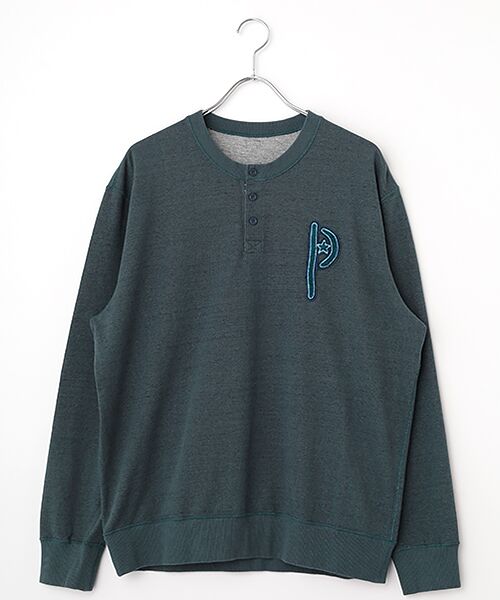 胸にPモチーフの刺繍ワッペンをあしらった、ヘンリーネックトレーナー。通常使用される天竺と裏毛の中間位の厚さであるミニ裏毛は、季節を問わずとても着やすい素材です。
