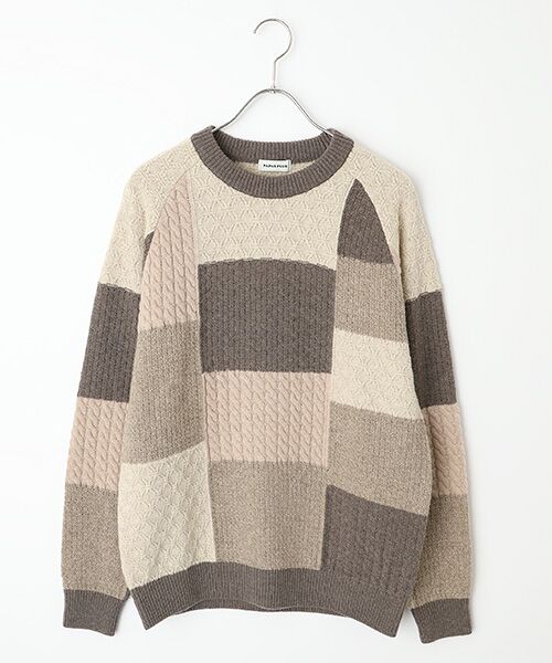 パッチワーク風の柄が目を惹く、ウール素材のクルーネックセーター。オーストラリア ジロン地方で産出されるメリノ種の仔羊から生後6か月以内に採取した毛『エクストラファインラムウール』、その中から厳選した。18.5μ以下の細い毛を使用しています。とても繊細でソフトな風合いが特徴です。細番手ではありますが紡毛糸のために膨らみが良く、とても軽くて保温性に優れた素材になっています。※クルーネック※ラグランスリーブ(長袖)※全身頃 色・編地違いのパッチワーク風柄