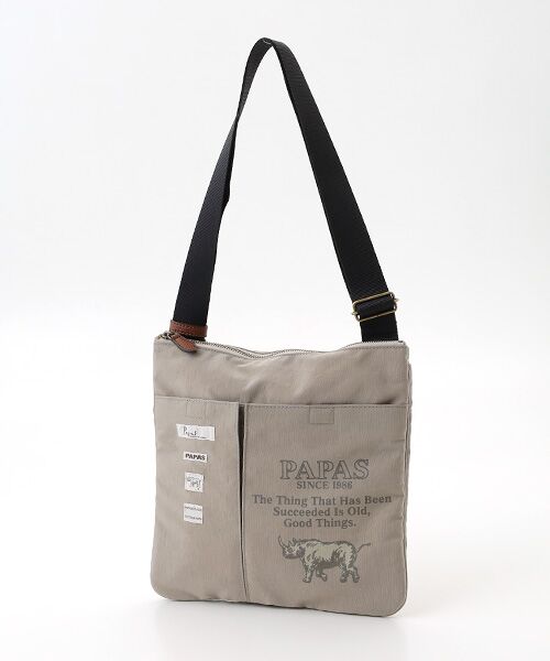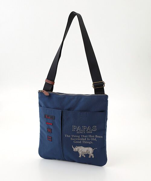 ロゴとサイのプリントや複数のネームをあしらったフラットなショルダーバッグ。昔のバッグを少しリメイクし作成しました。さっと取り出せる外ポケットや小物の仕分けに便利な内ポケット。すっきりとしたフォルムで普段使いにちょうどよいバッグです。