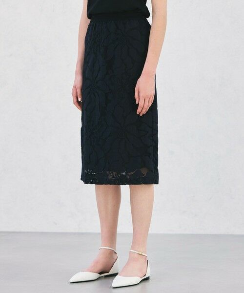 目を惹く花柄レースを贅沢に使用したIラインシルエットのスカートです。