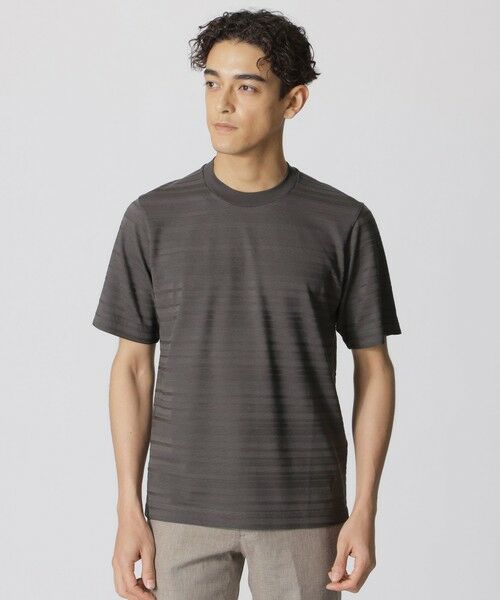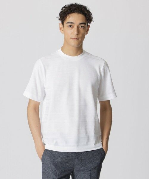 2025 Spring&Summer item Available2025年春夏シーズンの新作カットソー(Tシャツ)が登場。綿&ポリエステル素材のシャドウボーダー柄のTシャツ。生地には上品な光沢が出る加工(シルケット加工)を施し、カジュアルでありながらも大人な印象が特徴的。一見無地に見える生地ですが、よく見るとシャドウボーダー柄が入っているシックなアイテムです。デザインはシンプルなレギュラーフィットのTシャツデザイン。綺麗に首に沿う衿の作りで、衿が緩くなりづらい上品な見え感です。単品だけでなく、カジュアルにシャツのインナーまたはジャケットのインナーとしても着こなせるボーダーTシャツです。