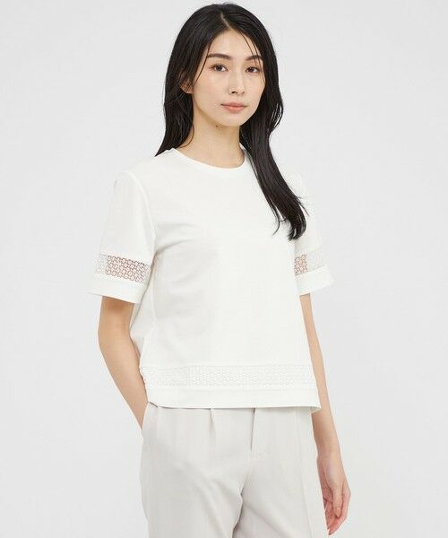 <レースがアクセントを効かせる上品ジャージプルオーバー>【素材】綿糸とポリエステル糸を使用した柔らかな風合いが特徴の素材です。表面に綿糸、肌に触れる裏面にポリエステル糸が出るような編み設計で吸水速乾機能に優れた素材を使用しています。さらっとした着心地を叶える吸水速乾機能に加え、接触冷感やUV対策などの嬉しい機能を多く兼ね備えた素材を使用しています。【デザイン】袖と裾にレースを施したジャージプルオーバーです。コンパクトなシルエットと短めの丈感ですっきりとしたスタイリングが仕上がります。袖のレース部分は透かしたデザインで清涼感のある印象にしました。一枚で着用するのはもちろん、インナーとしても着回ししやすい一着です。様々なスタイリングに合わせやすいベーシックカラーのホワイトとブラックに加え、上品な大人カラーのモカブラウンの3色展開です。同素材のプルオーバー:K1P11660ご自宅で手洗いできるウォッシャブル仕様です。モデル(ディテール画像):H171 B77 W59 H87 着用サイズ:6