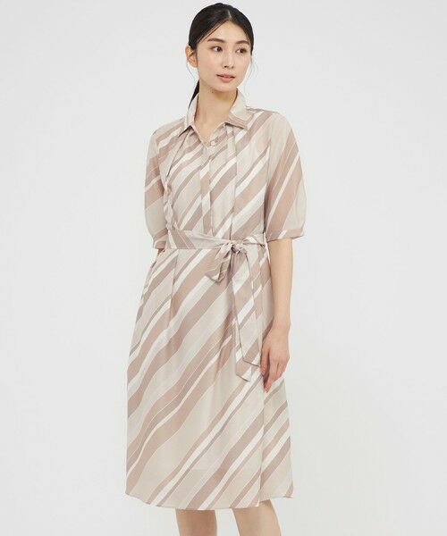 <上品なストライプ柄のシャツカラーワンピース>