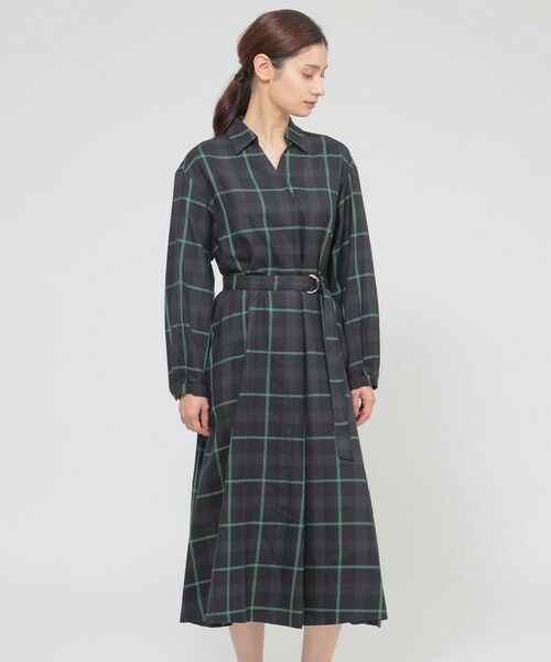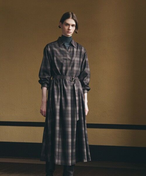 <スキッパーデザインがエレガントな着映えワンピース>【素材】尾州産の上質な素材を使用しています。風合いの良いウール糸と強度のあるポリエステル糸を撚糸した素材で、適度なハリ感がありつつ上質な柔らかさを感じられる素材です。上品な光沢感と滑らかな肌触りが特徴となっています。ご自宅で手洗いできるウォッシャブル仕様でシワになりにくいイージーケアな素材です。【デザイン】オリジナルのチェック柄とカラーリングの一着で着映えるワンピースです。裾に向かって程良いフレア感が上品な一着です。ゆったりとしたリラックス感のあるシルエットながらも後ろウエストを程良く絞りすっきりとした一着に仕上げました。附属のDカン付きベルトでウエストマークをすればメリハリのあるシルエットが完成します。襟はスキッパーデザインできちんと感を演出し、様々なシーンでエレガントな着こなしが叶います。同系色のニットジレとレイヤードしたスタイリングもおすすめです。モデル(ディテール画像):H168 B78 W59 H83 着用サイズ:6