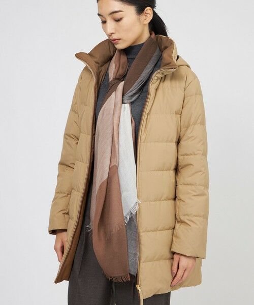 <色の重なりが陰影をつくりだすエレガントストール>上品な光沢と柔らかな風合いが特徴の素材を使用しています。軽くふんわりとした肌触りが心地良い素材です。繊細な糸を使用した薄手の素材でワイドサイズながらも長いシーズン活躍する一品です。同系色の濃淡配色をブロックのように配置し、襟元に巻いた際に陰影のあるスタイリングが完成します。タテのラインにラメ糸を使用し、さりげないポイントを付けています。