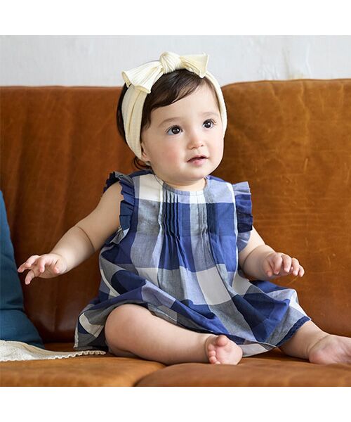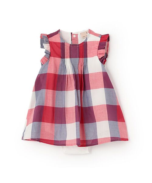幅広のマドラスチェック柄で仕上げたワンピース風ロンパースです。