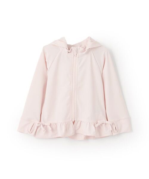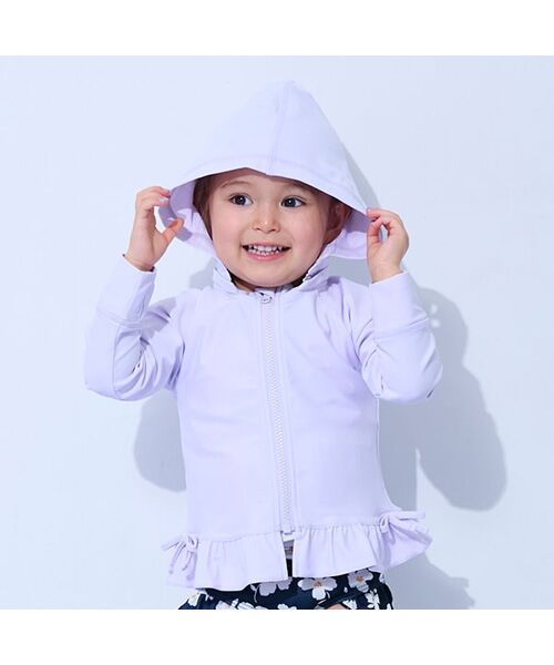 水着と合わせて可愛く着用できるラッシュガードです。裾にあしらったフリルデザインが魅力。ミニリボンもさりげないポイントです。つけ外し可能なフードつき。袖口は指が出せるサムホール設計です。UVカット加工をほどこしており、暑い季節のアクティビティに活躍します。【透け感】透けない【生地の厚さ】普通【伸縮性】あり【裏地】なし【ポケット】なし