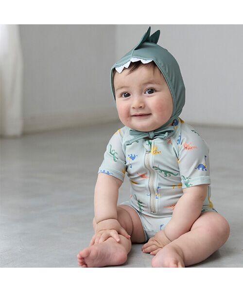 生き物になりきれるスイムキャップがセットの総柄水着です。