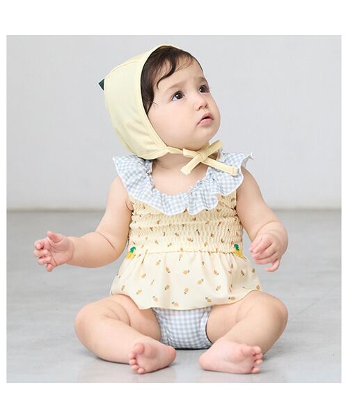 立体的なヘタデザインのキャップがついたフルーツビキニです。ウエストにあしらったイチゴモチーフでアクセントを加えました。衿とパンツはさわやかなギンガムチェック柄。フリルをほどこし、華やかに仕上げました。キャップは調節可能な紐つき仕様です。内側にお名前を記入できるタグがついています。【透け感】透けない【生地の厚さ】普通【伸縮性】あり【裏地】なし【ポケット】なし